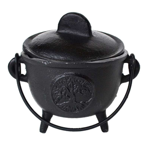 A solid black cast iron cauldron bearing the raised image of a Tree of Life on both sides of the cauldron, having a removable lid with top handle, and a metal swing handle attached to each side loop handles, the bottom having 3 raised sturdy legs.