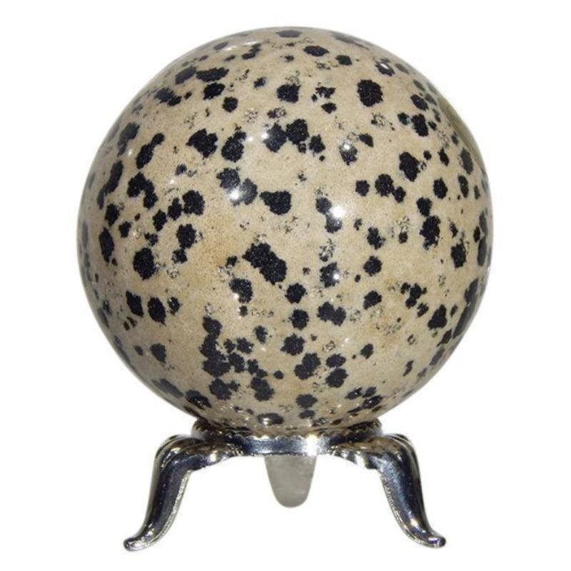 Dalmatian Jasper Spheres are tan with black specks of Iron Oxide or Tourmaline, causing many to compare this crystal’s appearance to the coat of a Dalmatian dog. Almost filling the palm of the hand, these Dalmatian Jasper Spheres would be an attractive focal point on an altar.
