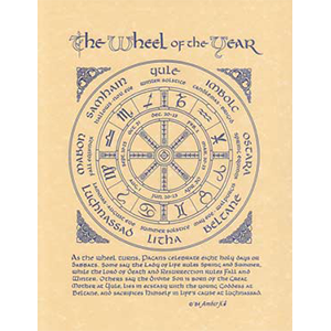The Wheel of the Year Poster depicting astrological signs and where they are in relations to the Sabbats. Quote from poster. As the wheel turns, Pagans celebrate eight holy days or Sabbats. Some say the Lady of fire rules spring and summer, while the Lord of Death and Resurrection rules the Fall and Winter. 8 1/2″ x 11″.