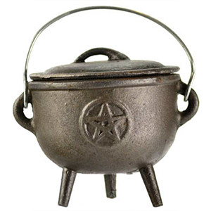 A cauldron bearing the raised image of a pentagram on both sides of the cauldron. These cauldrons are all individually sand molded and unique from every other. Made in a two part casting process; seams may be visable and rough on some cauldrons. 4″ x 4″