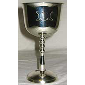 A silver-plated chalice, this cup features the triple moon symbol of the goddess engraved on opposing sides. Silver plated, it is food and drink safe. 5 1/2” x 2 1/2” tapered to 3 1/4”