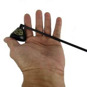 A long handled candle snuffer with a free moving 1″ deep bell. Black enamel with a gold enamel engraved pentagram. 7″